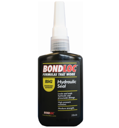 | Bondloc B542 Medium Strength Hydraulic Seal 50ml Applications B542 Hydraulic Seal is a thixotropic liquid which cures Anaerobically to form a tough, high pressure seal on all types of threaded couplings used on low, medium and high pressure lines. Properties |
